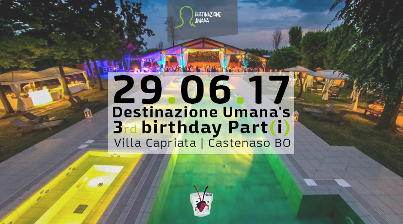 Quindi: se ti piacerebbe festeggiare insieme a noi i primi tre anni di Destinazione Umana, unisciti alla festa che faremo il 29 GIUGNO dalle 19:30 a mezzanotte circa, presso Villa Capriata a Castenaso (BO).